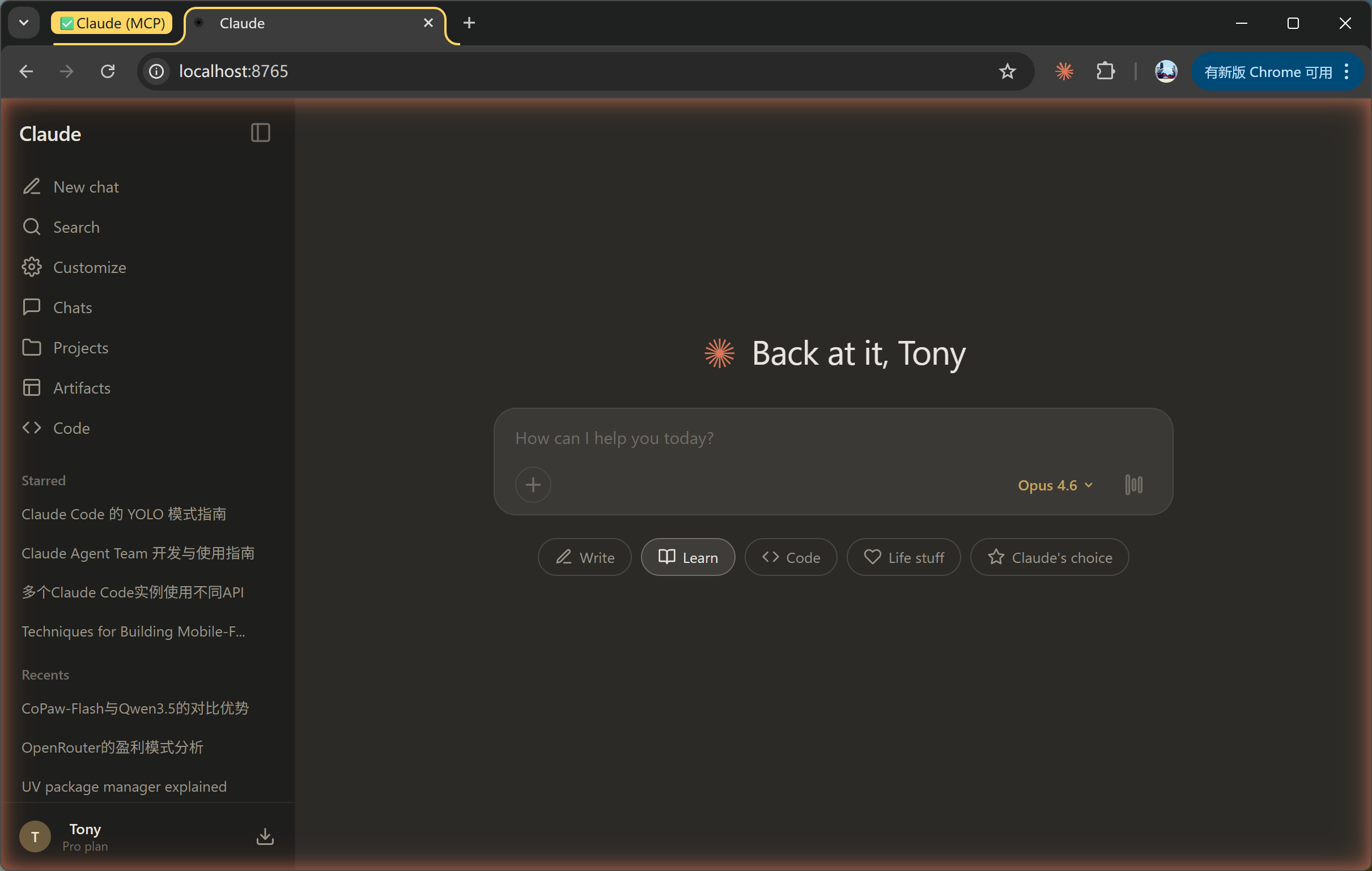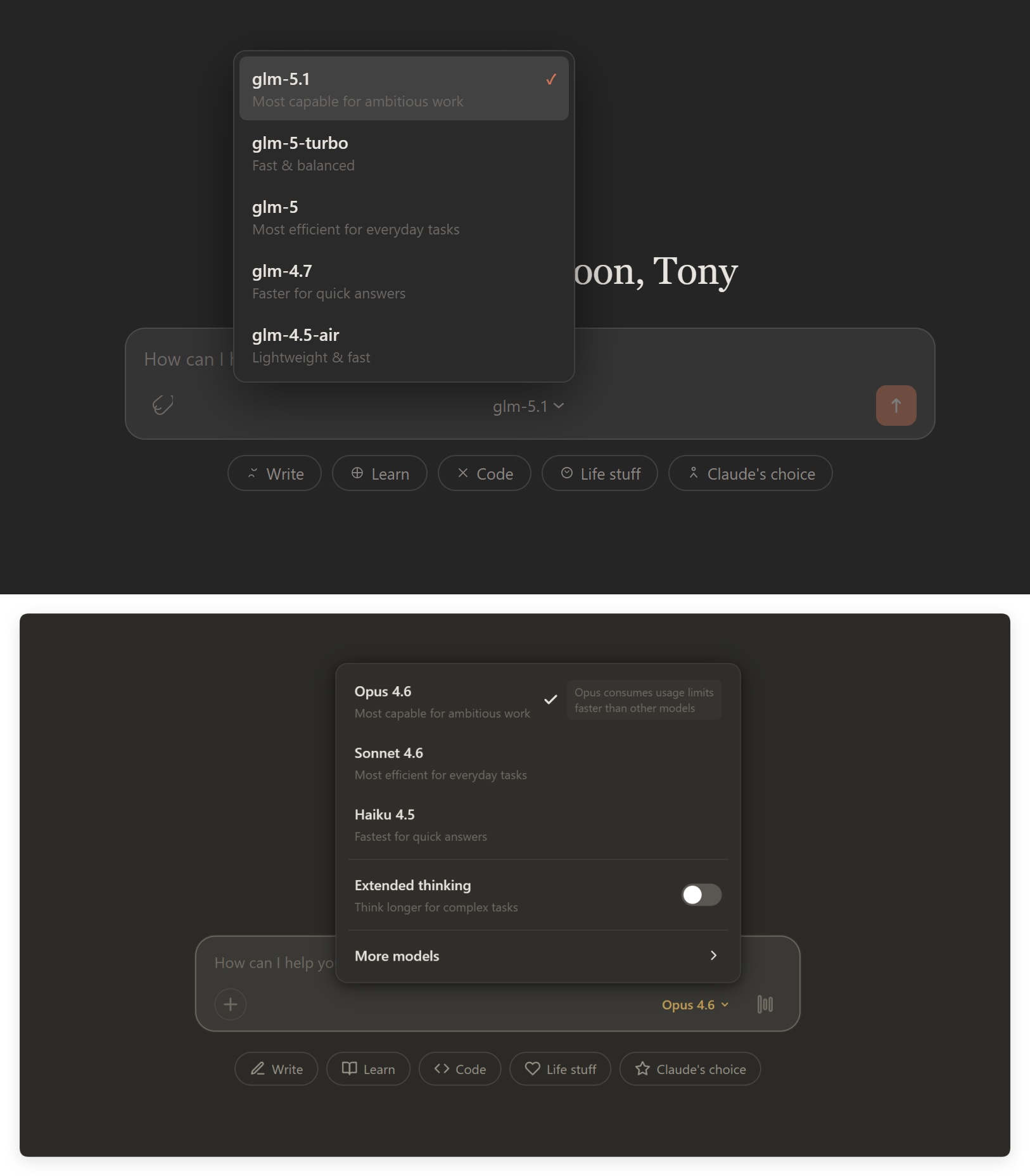 Opus 保持了页面的显示效果,以及包含了 Extend Thinking 的开关按钮和 Models 更多选项。在真正调用的时候,它会映射了我给的模型。