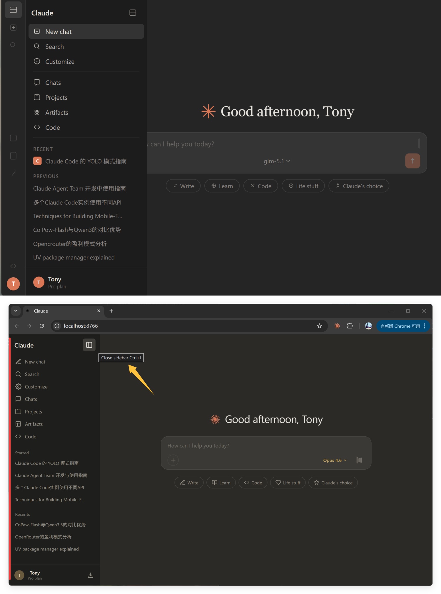 Opus 的左侧菜单以及历史对话,包括加星的和最近的对话列表,全都是对的。千问是有好几项对不上的。