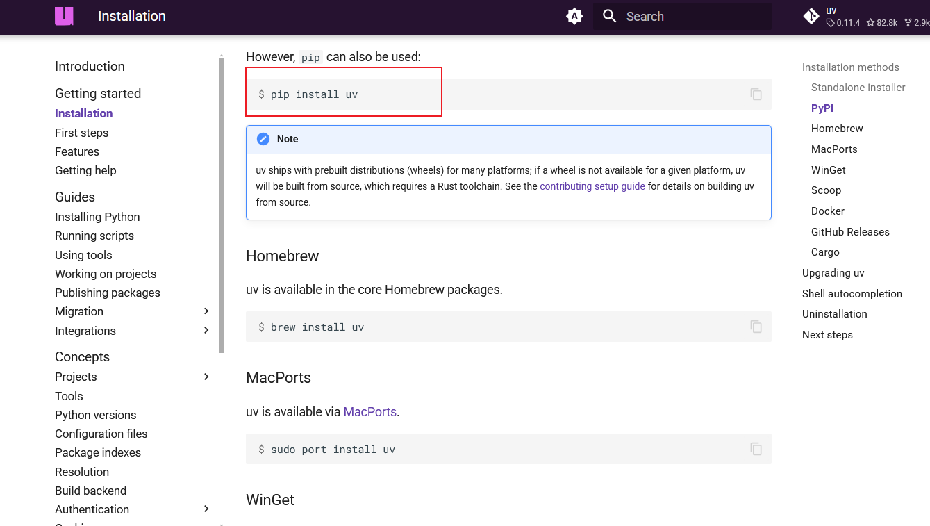 - pip安装: 可以通过pip install uv或pipx install uv进行安装,后者推荐用于隔离环境。