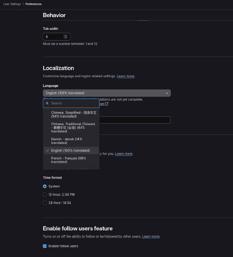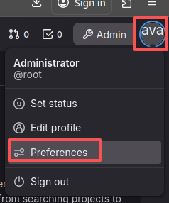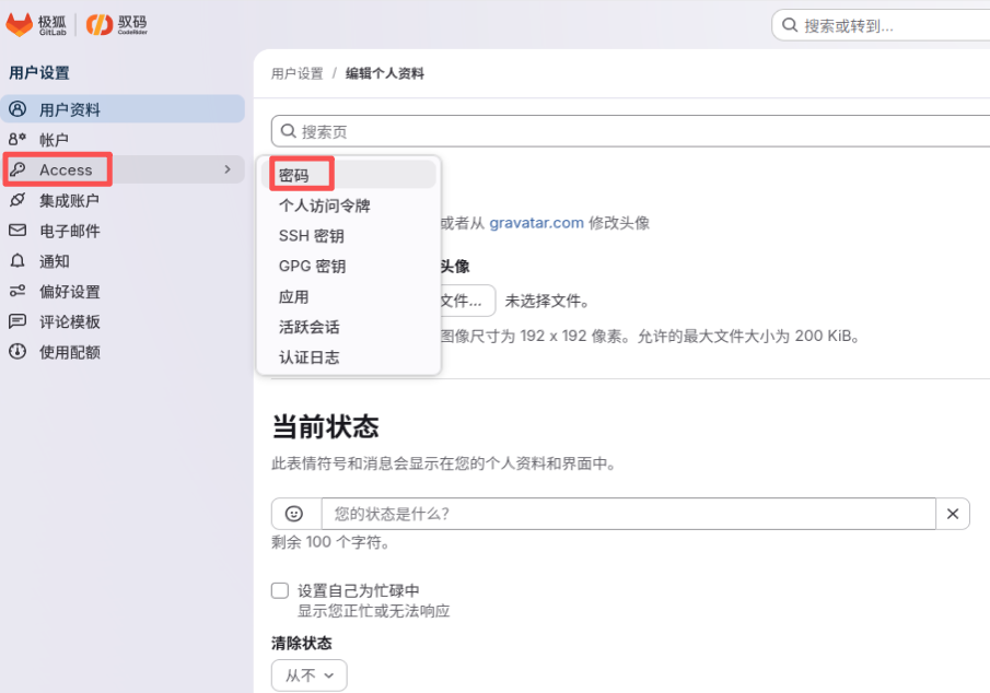 我们用的gitlab是国内专供的,因此有中文显示,点击右上角头像,选择Preferences: