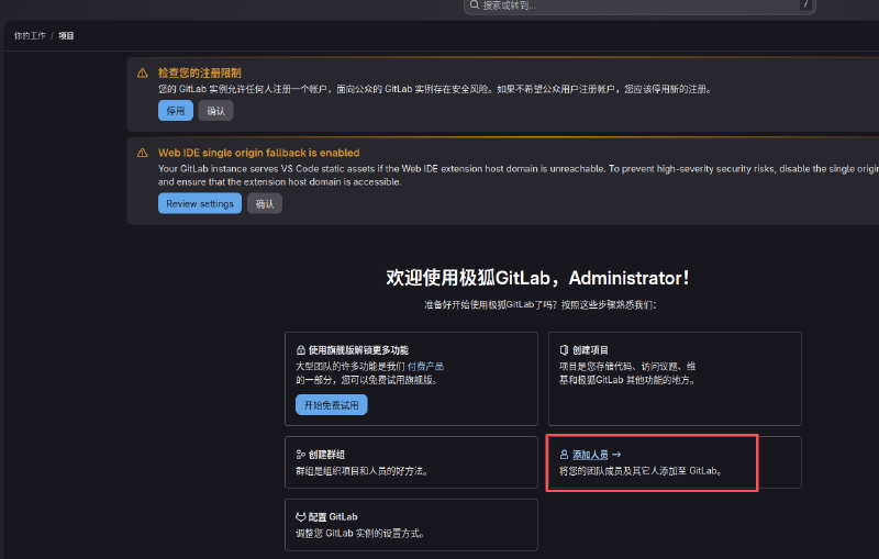 gitlab的新用户不同于其他应用,他是必须用root账号根据个人的邮箱登信息统一申请管理的,因为gitlab不同于gitee或github,它只在一个局域网内生效。假设我们现在是一个创业小公司,gitlab仓库在一个原生 linux服务器,一共有三个员工,其中一个人负责运维,管理gitlab的所有账号及权限,另一个人是项目负责人,负责将项目分成多个模块以及下发开发任务,还有一个苦逼打工仔,负责实际的代码开发。当然在这个假设场景中,三个员工都是我们自己,我们先扮演运维为每个员工都分配自己的账号。登录root账号,在首页点击添加人员(如果和我的页面不一样,可以转到网站 https://本地IP 找到项目->添加人员)