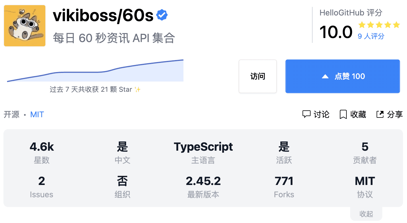 该项目集合了包括每日新闻、实时票房、汇率、热搜榜、随机段子等多种数据的 API 服务。