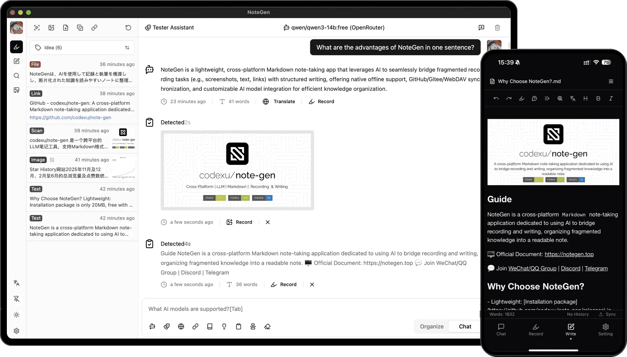 基于 AI 的 Markdown 笔记应用。这是一款跨平台的 Markdown 笔记应用,专注于用 AI 搭建"记录-写作"的桥梁。它不仅支持截图、文本、插图等多种记录方式,还能通过 AI 模型将这些碎片化内容整理成可读的笔记。