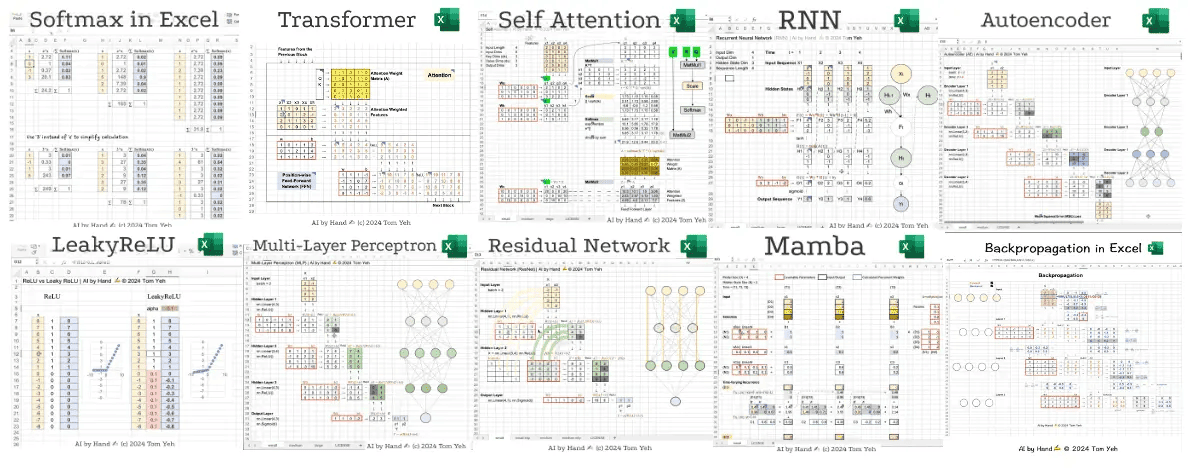 该项目是通过 Excel 的形式实现并演示人工智能与深度学习的核心算法和概念,让初学者可以动手操作并理解 AI 的运行原理,包括矩阵乘法、MLP 、RNN 、Transformer 、ResNet 等,以独特且浅显易懂的形式,降低了 AI 学习的门槛。