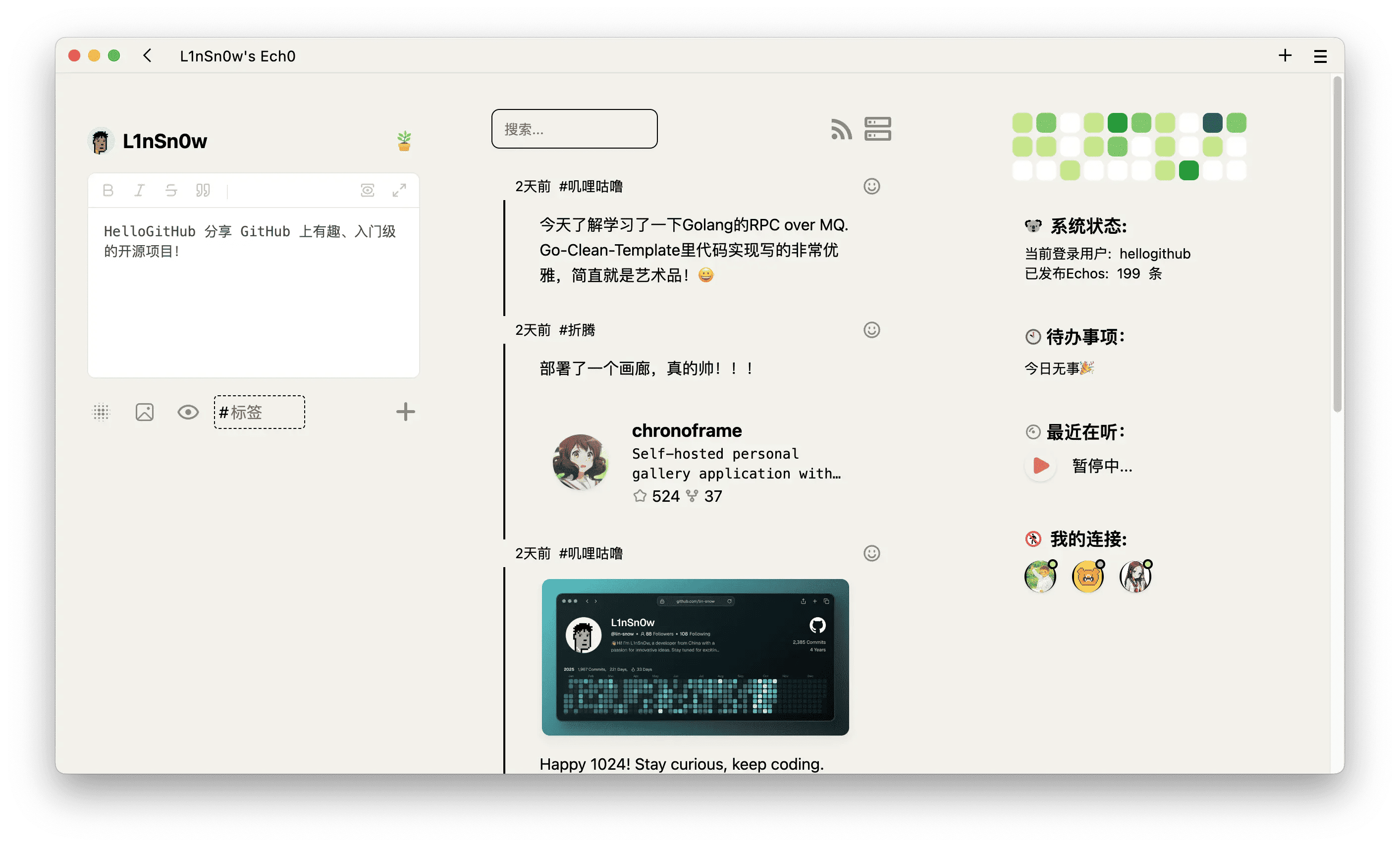 清爽的轻量级内容分享平台。这是一款开源、自托管的轻量级内容发布平台,专注于思想流动和快速分享。它拥有简洁直观的操作界面,支持发布和分享想法、文字、图片和链接。同时,支持类似 ActivityPub 的联邦协议,实现不同实例(站点)之间的互联互通,让内容不再局限于单一孤立的网站。