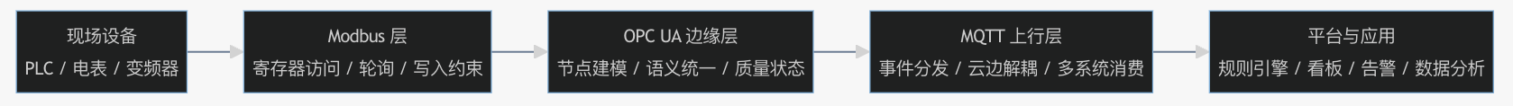 | Modbus 接入后在网关统一成 OPC UA | 多厂商设备、需要统一对象视图 | 语义清晰,边缘治理能力强 | 网关设计和映射工作更重 |