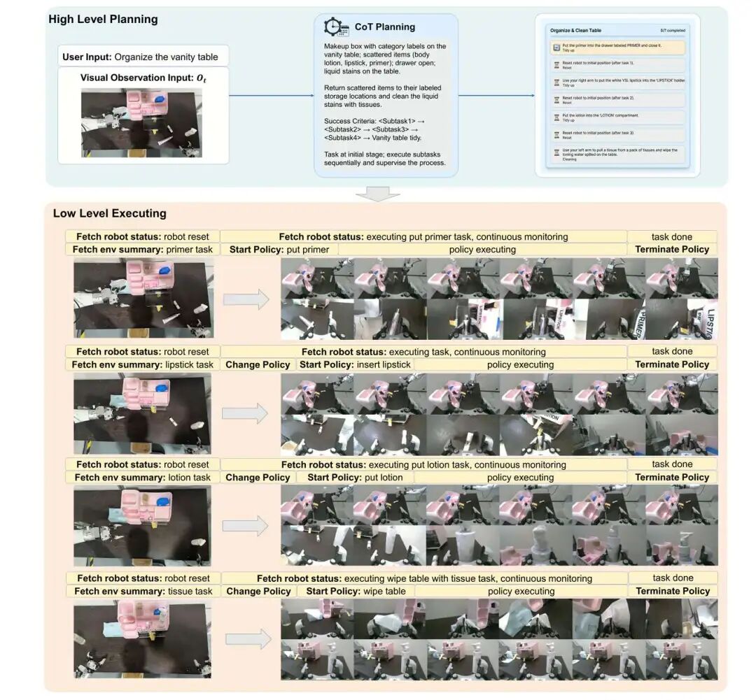 这并非传统意义上的单步动作策略,而是一套具备自主感知、自主推理、自主执行、自主修复、自主迭代能力的具身智能体。它不再局限于解决单一动作精度问题,而是打通机器人从实验室走向产业现场的全链路,攻克长时序任务执行脆弱、人工依赖过重、无法规模化扩展的行业难题。