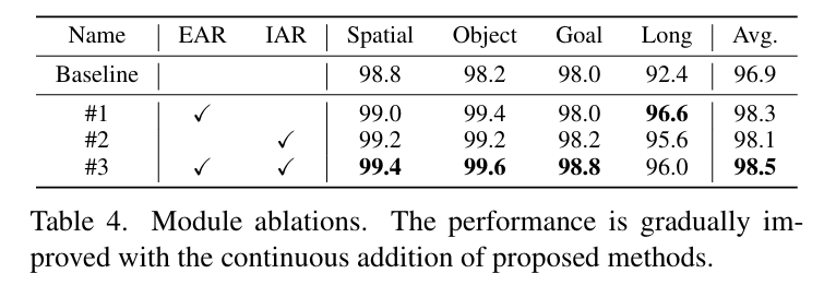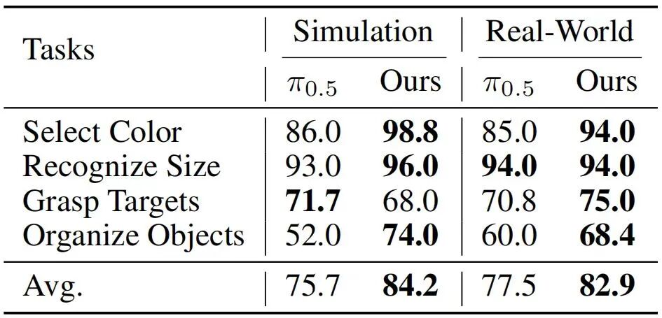 在真实桌面操作任务中,这一范式革新带来直观的体验提升:抓取不再空夹、移动不再飘移、放置不再偏移。在 LIBERO 仿真基准上,动作原生推理带来稳定且显著的性能提升,平均成功率达到 98.5%,尤其在需要严格误差控制的长时域操作任务上,提升幅度远优于传统语言 / 视觉思维链方法。核心原因在于:动作思维链天然为长序列动作提供结构化约束,让误差不再无限制扩散。