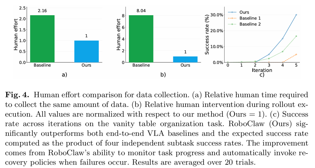 在数据采集阶段,机器人基于纠缠动作对(EAP) 机制,将前向操作策略与逆向恢复策略深度耦合,构建自重置循环。完成单次操作后,机器人可自主将环境恢复至可复用的初始状态,无需人工介入即可实现连续在线rollout与策略迭代。真实场景实验数据验证,该模式可降低53.7%的人工时间投入,人工干预频率降低8.04倍,让低成本、规模化数据采集成为现实。