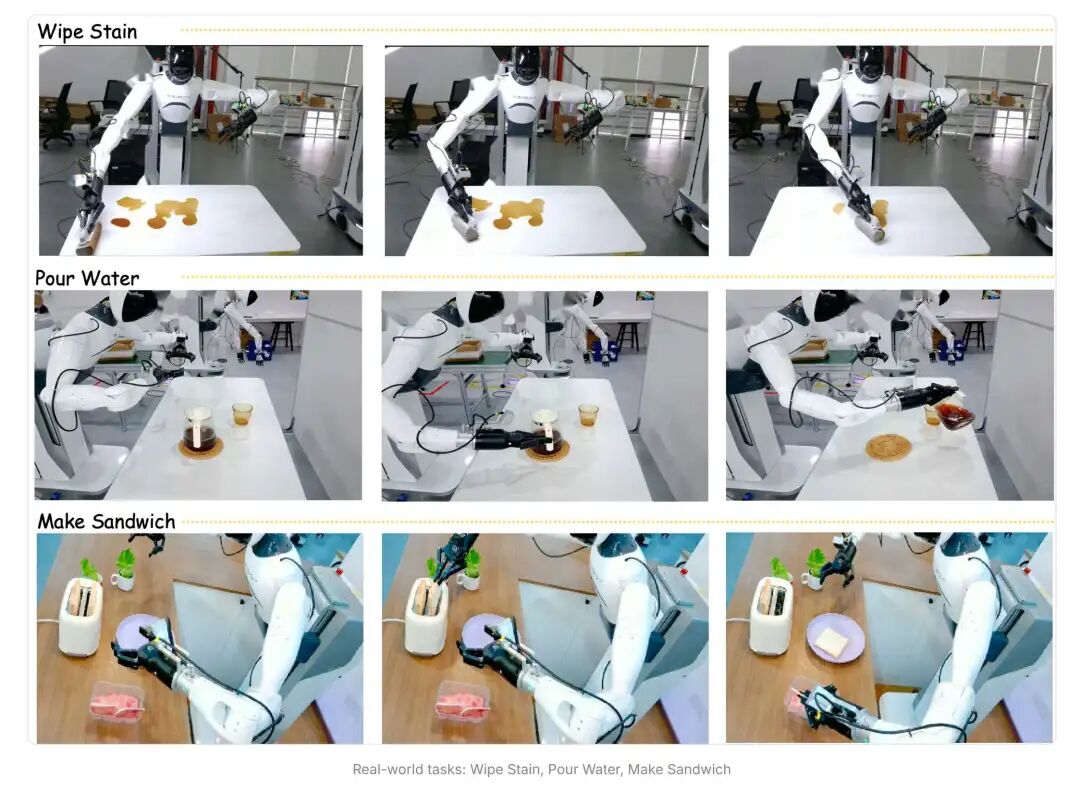 在真实场景测试中,异步双系统的价值尤为明显:桌面高度不一致、物体轻微滑动、光照突然变化等场景下,机器人可在线调整动作,减少误差累积,但仍存在一定局限性------当分箱粒度偏离均衡点、时域扩展因子M过大(M≥5)时,成功率会出现轻微下降(平均成功率从97.2%降至95.3%)。长时域任务中,误差得到有效控制,机器人可稳定完成多步骤、多阶段的复杂操作。对于需要连续接触、精细调整、姿态保持的任务,比如擦拭、倒水、插入、装配,这种结构带来的稳定性提升尤为关键,在AgiBot G1机器人平台的真实测试中,GO-2完成此类任务的平均成功率达到69.4%,显著优于同类模型。