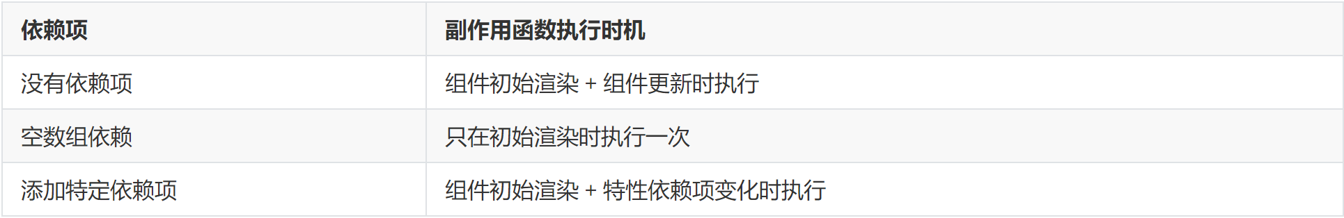 useEffect 副作用函数的执行时机存在多种情况,根据传入依赖项的不同,会有不同的执行表现