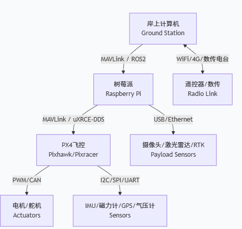 上行:地面指令("飞向航点A"、"调整参数")→ 树莓派 → PX4