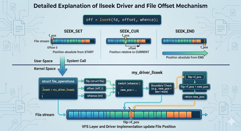 这篇就把这条链路完整讲清楚:从用户态 lseek(),一路走到驱动层 file_operations.llseek