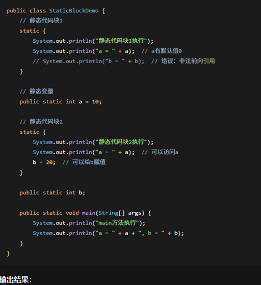 - 按照代码中的顺序依次初始化静态变量和静态代码块