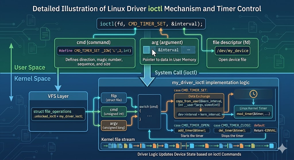 ioctl 是 Linux 设备驱动开发中不可或缺的核心接口。理解它的命令码编码规则、四个命令宏的用途、内核中 unlocked_ioctl 的实现方式以及用户空间的调用方法,是掌握字符设备驱动开发的关键一步。在实际项目中,合理地使用 ioctl 可以让驱动更加灵活、功能更加丰富。