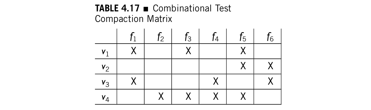 - covering algorithm:用一个矩阵,行代表向量,列代表对应能检测的故障,以下图为例: