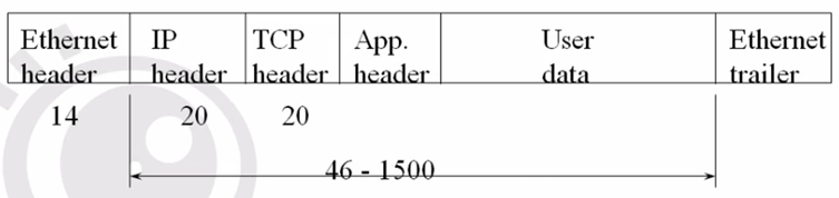 | 以太网头部 (14B) | IP 头部 (20B) | TCP 头部 (20B) | 应用层头部 | 用户数据 | 以太网尾部 |