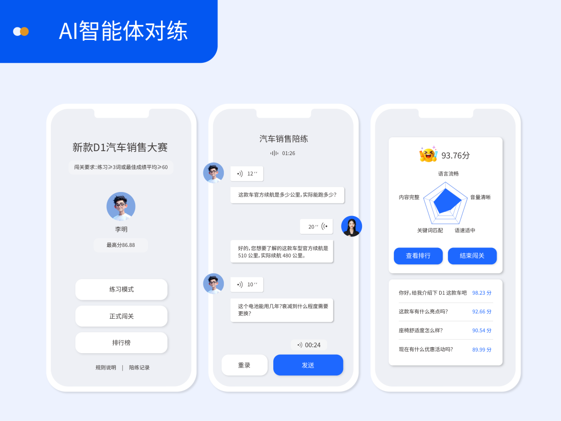 **1.**销售岗学习产品知识后,通过AI智能体对练模拟客户异议处理、商务谈判,系统实时反馈话术问题;并参加在线考试,考核产品卖点、合规话术等,综合考试错题设计陪练场景,从而进行二次实战演练强化