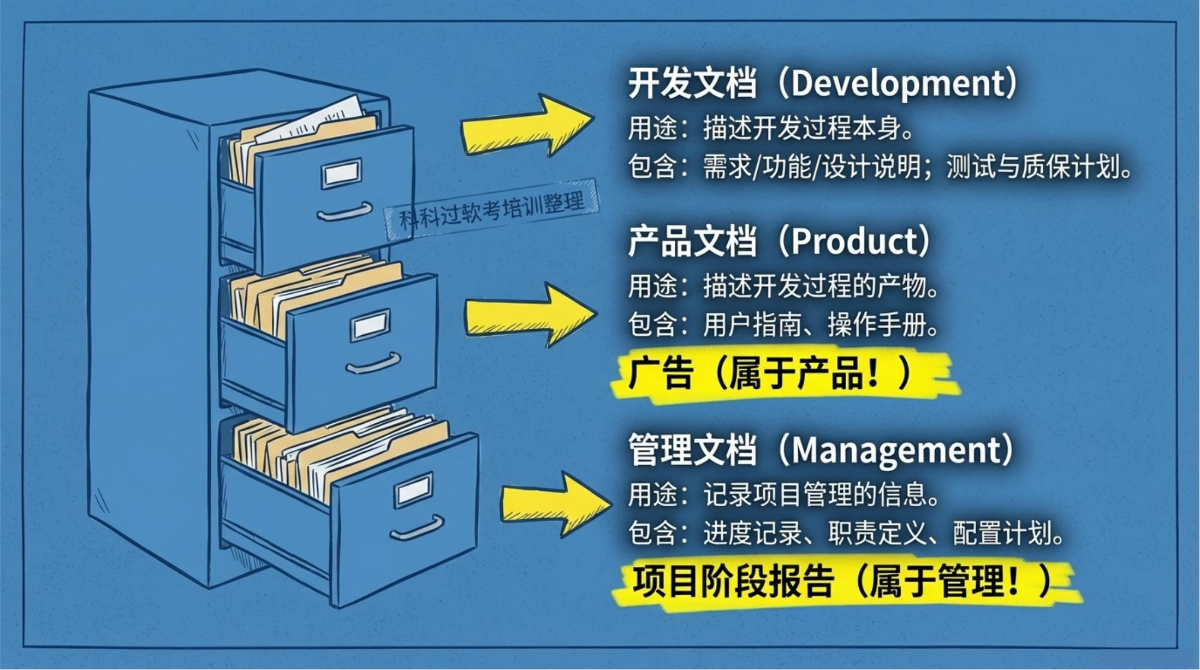 | 管理文档 | 记录项目管理的信息 | 进度/变更的记录;职责定义;项目阶段报告;配置/项目计划 |