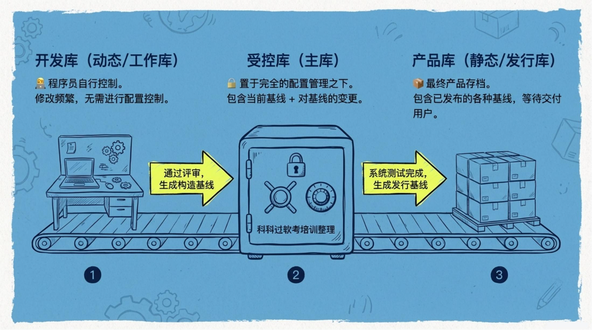 | 产品库 | 静态库、发行库、软件仓库 | 包含已发布使用的各种基线的存档。完成系统测试后作为最终产品存入,等待交付 |