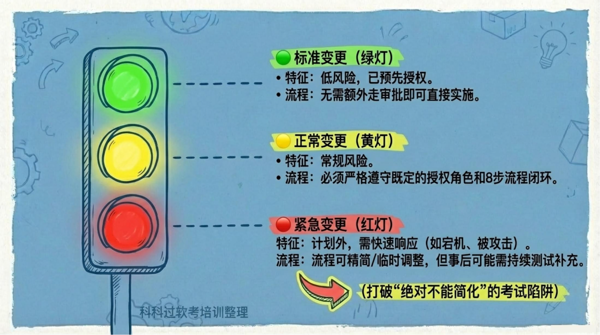 | 紧急变更 | 不包括在计划中,必须快速响应(如业务中断、安全攻击)。程序可精简,但测试及调整可能在实现后持续 |