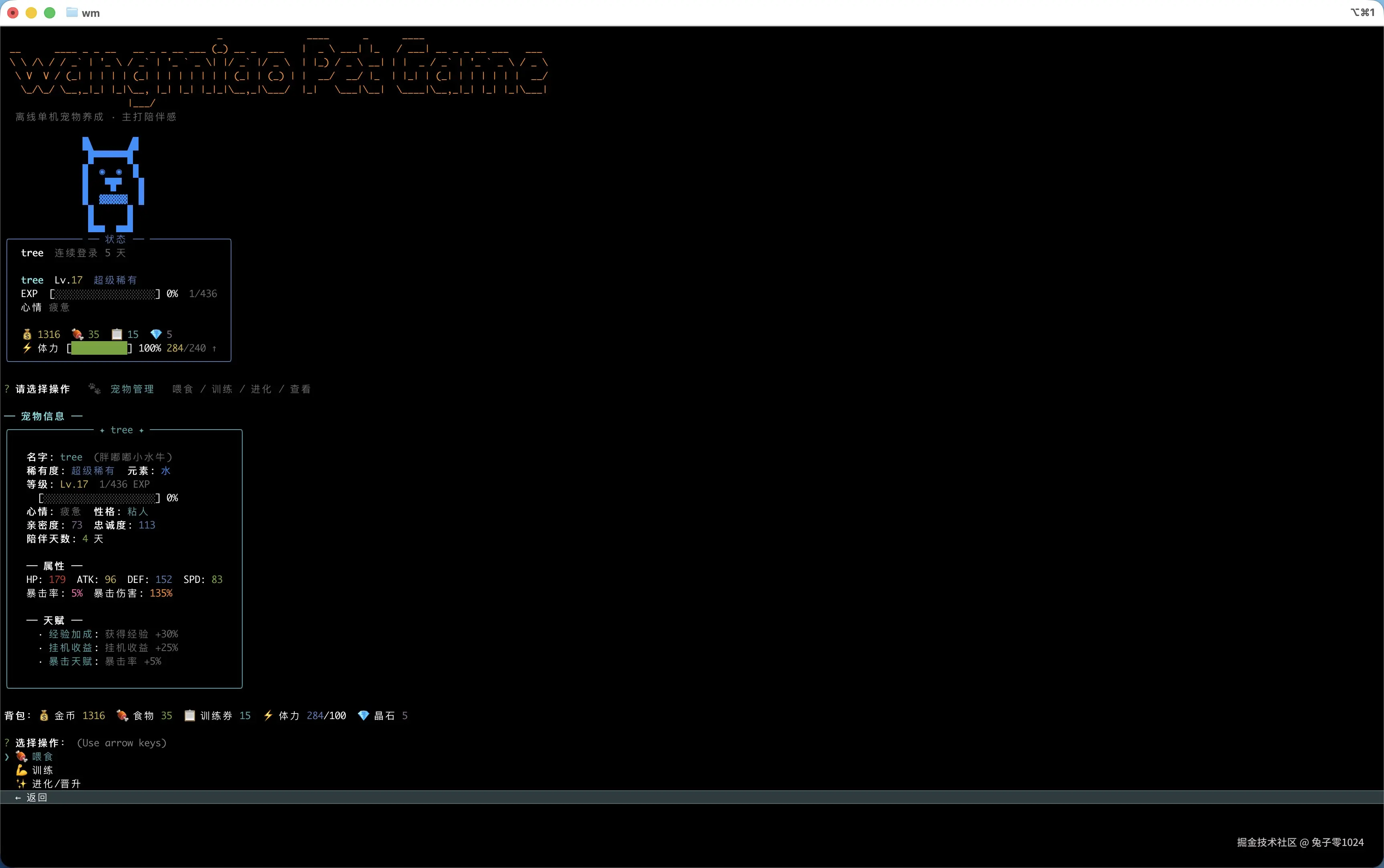它是一款离线单机 CLI 宠物养成游戏。你打开终端,就能领养一只宠物,给它起名字,喂它、训它、陪它聊天、带它打架、刷 Boss、做成长,慢慢把它从普通养到神话。
