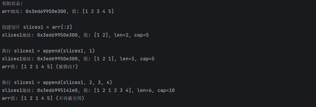 fmt.Printf("slices1地址: %p, 值: %v, len=%d, cap=%d\n",