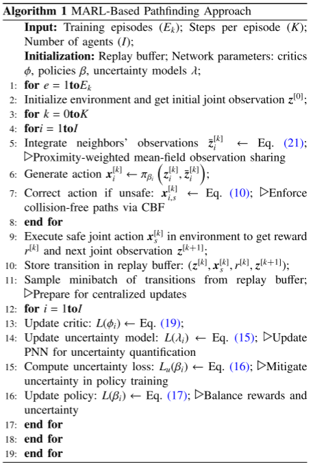 在多智能体深度确定性策略梯度(MADDPG)算法的训练框架下,该不确定性损失被整合进无人机局部策略网络的优化过程中。系统通过超参数 ϵ u \epsilon_u ϵu 来平衡标准策略损失 L ∗ ( β i ) L^*(\beta_i) L∗(βi)( E [ − Q ϕ i ( z [ k ] , x s [ k ] ) ] \mathbb{E}[-Q_{\phi_i}(z^{[k]}, x_s^{[k]})] E[−Qϕi(z[k],xs[k])],用于最大化的奖励)与不确定性最小化,修正后的策略总损失函数为: