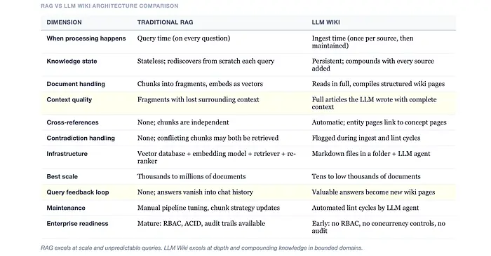 他们有合理的观点。最尖锐的批评?Karpathy 并没有杀死 RAG;他只是重命名了缓存层。任何将大语言模型维基作为新正统推出的人将在六个月后艰难地重新发现去重和失效问题。
