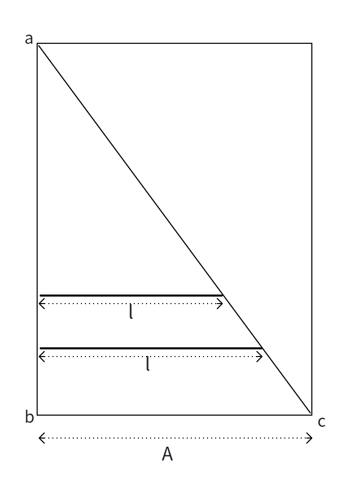 如图所示的三角形 abc,显示了组成这个三角形的一些线 l,卡瓦列里将这个区域的面积视为所有这些线的长度之和 ∑l,整个矩形的面积等于所有长为 A 的线之和 ∑A。