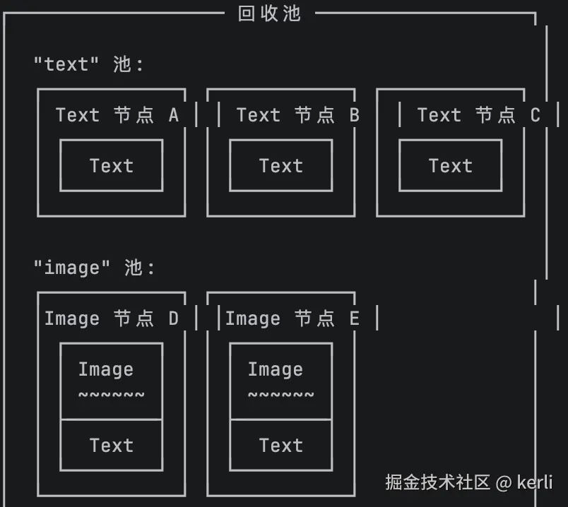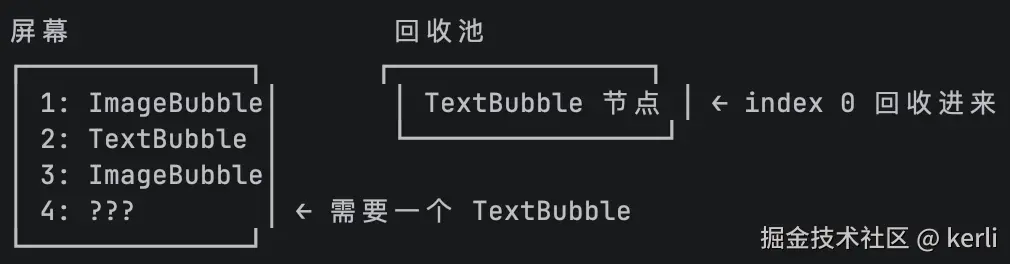 运气差:池里先进先出,拿到的是 TextBubble 节点 → 结构不匹配 → 整个 composition 要拆掉重建 → 慢