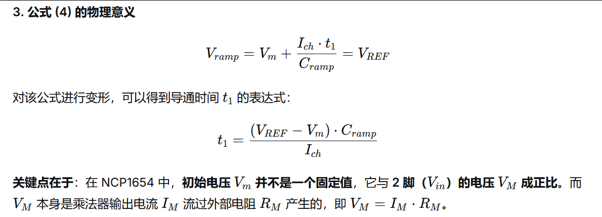 - 输入电压低或轻载时,VMVM 低,斜坡起点 VmVm 低,到达 VREFVREF 需要的时间更长,t1t1 变长。