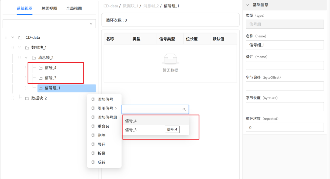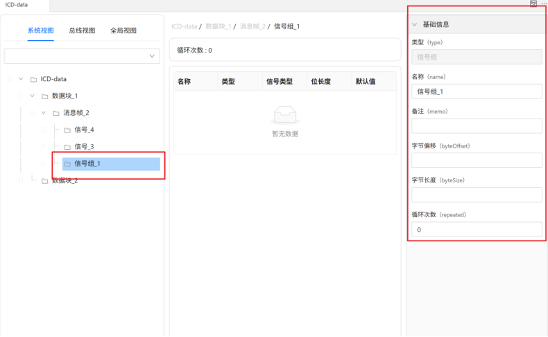 在ICD编辑器系统视图下,点击ICD结构树的"信号组_1"节点,右侧自动展示该信号组的基础信息,如下图所示,用户可根据需求进行更改。