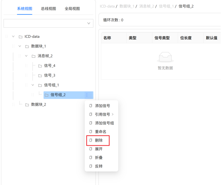 在ICD编辑器页面,鼠标悬浮在ICD结构树的【信号组_2】节点,后方会出现图标,点击图标后弹出悬浮框,在悬浮框中点击【删除】菜单,如下图所示。该信号组会在项目中被删除。
