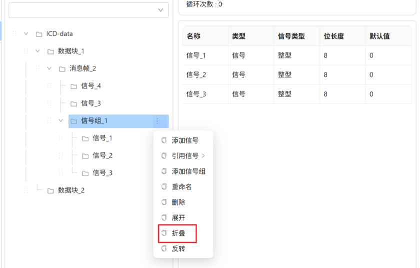 在ICD编辑器页面,鼠标悬浮在ICD结构树的【信号组_1】节点,后方会出现图标,点击图标后弹出悬浮框,在悬浮框中点击【折叠】菜单,如下图所示。系统会自动将该信号组下所有的项目折叠。
