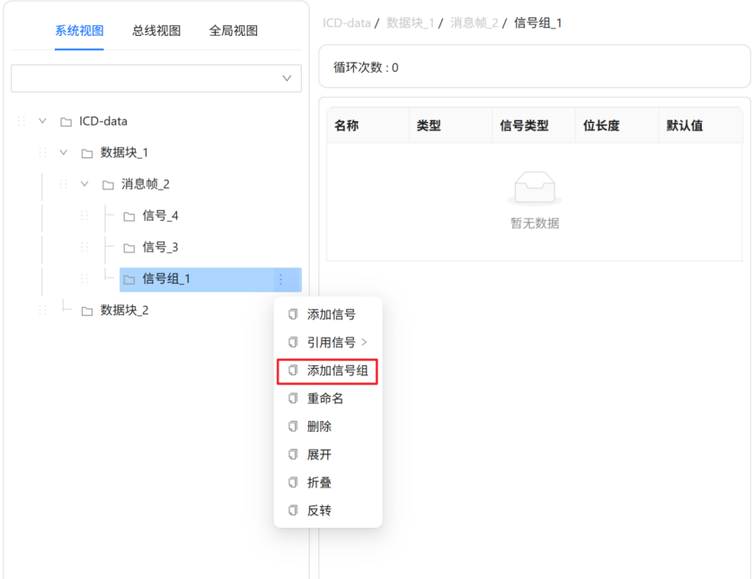在ICD编辑器页面,鼠标悬浮在ICD结构树的【信号组_1】节点,后方会出现图标,点击图标后弹出悬浮框,在悬浮框中点击【添加信号组】菜单,如下图所示。在该消息帧中会创建一个信号组,并支持修改名称。