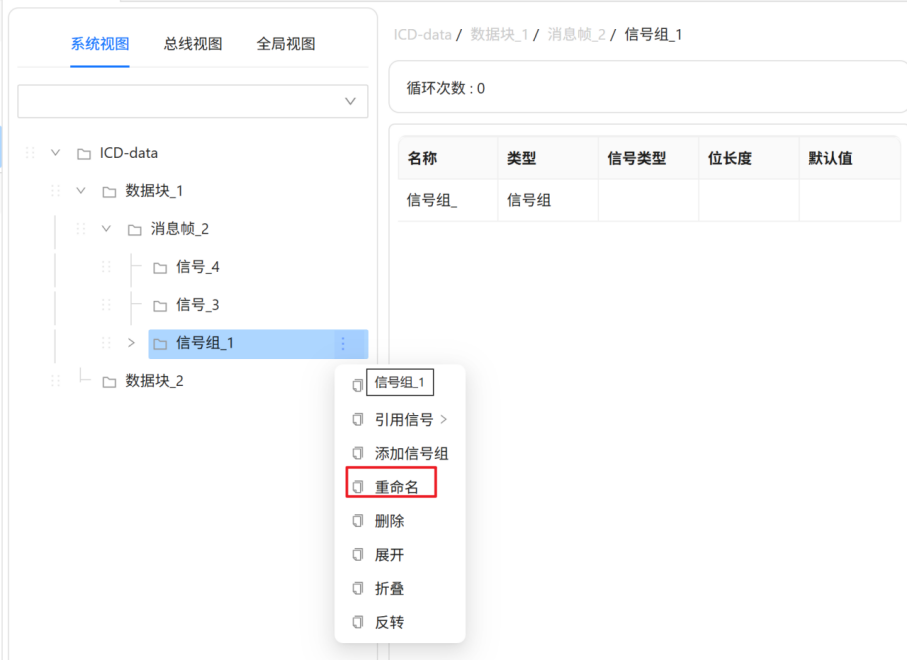 在ICD编辑器页面,鼠标悬浮在ICD结构树的【信号组_1】节点,后方会出现图标,点击图标后弹出悬浮框,在悬浮框中点击【重命名】菜单,如下图所示。用户可根据自身需要进行消息帧名称的修改。