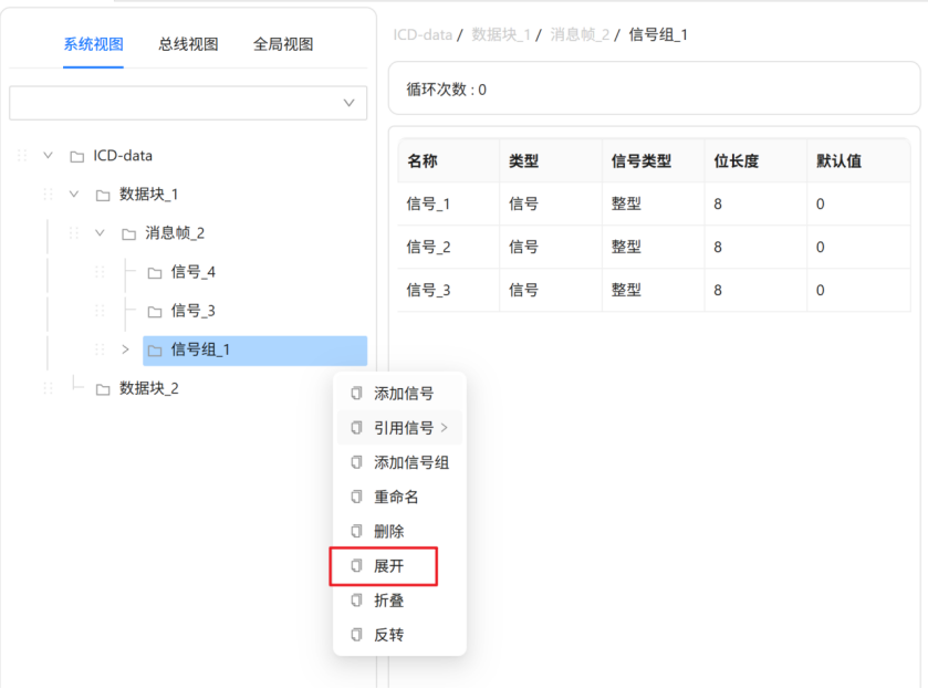 在ICD编辑器页面,鼠标悬浮在ICD结构树的【信号组_1】节点,后方会出现图标,点击图标后弹出悬浮框,在悬浮框中点击【展开】菜单,如下图所示。信号组会展示所有下属文件。