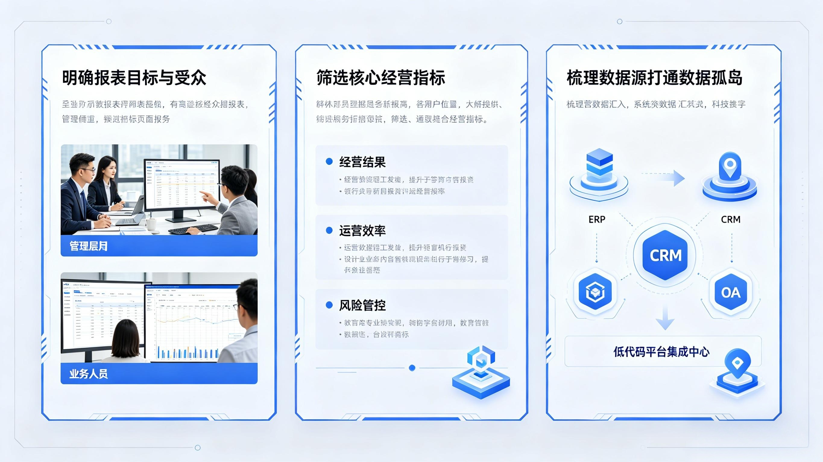 制作BI报表的核心是"用数据解决问题",而非单纯堆砌指标。很多企业报表开发失败,并非技术不足,而是需求未明确、指标不清晰,导致"做出来没人用"的尴尬局面。在动手设计前,需先完成3个核心准备工作,这也是后续报表高效落地的基础。