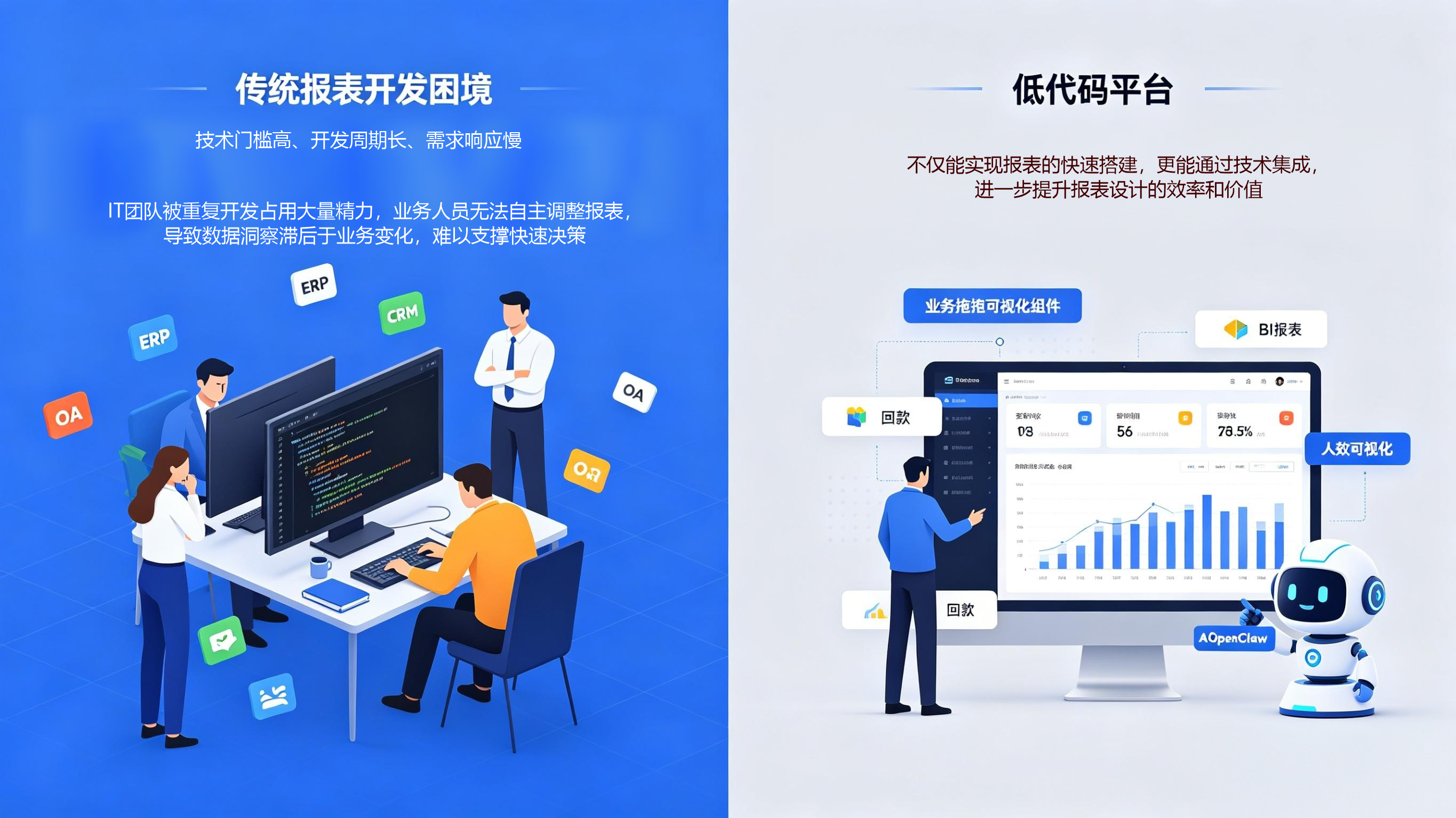 BI报表需要整合营收、利润、回款、人效等核心经营数据,将分散在ERP、CRM、OA等系统中的数据转化为可视化、可解读、可落地的洞察。但传统BI报表开发往往陷入"技术门槛高、开发周期长、需求响应慢"的困境------IT团队被重复开发占用大量精力,业务人员无法自主调整报表,导致数据洞察滞后于业务变化,难以支撑快速决策。