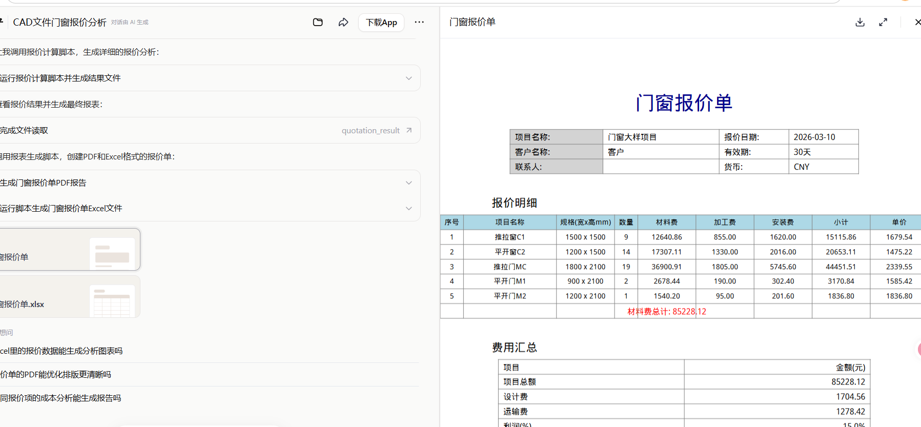 通过 3D 模型分析 + 自动化报价脚本,一键生成明细报表。