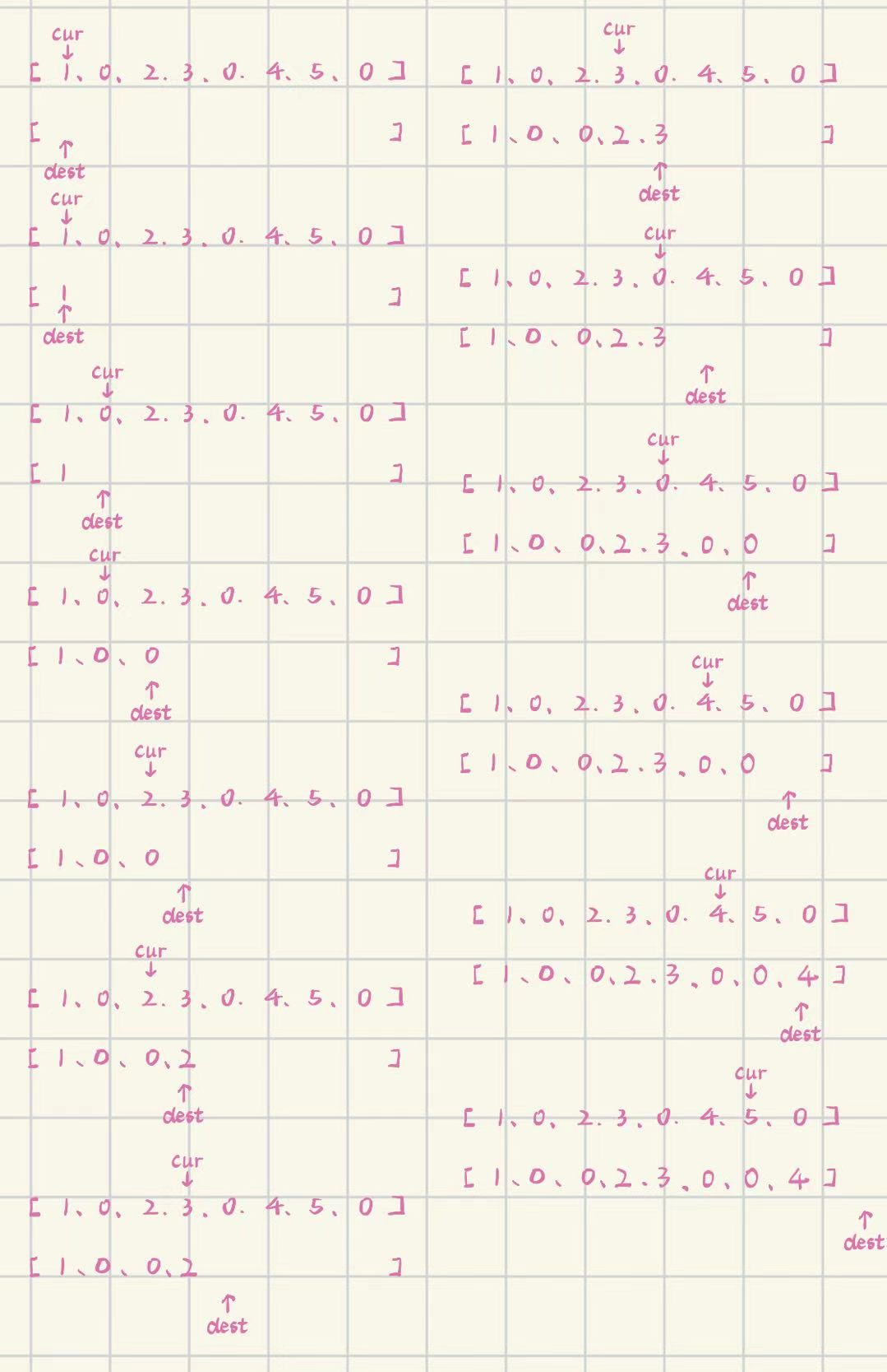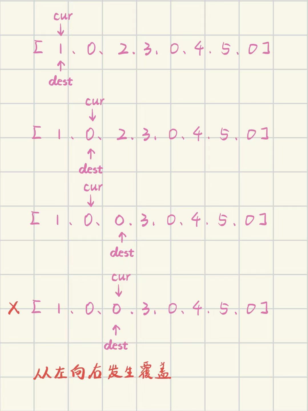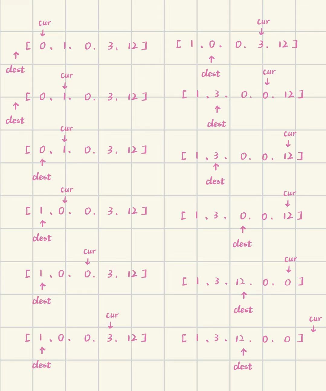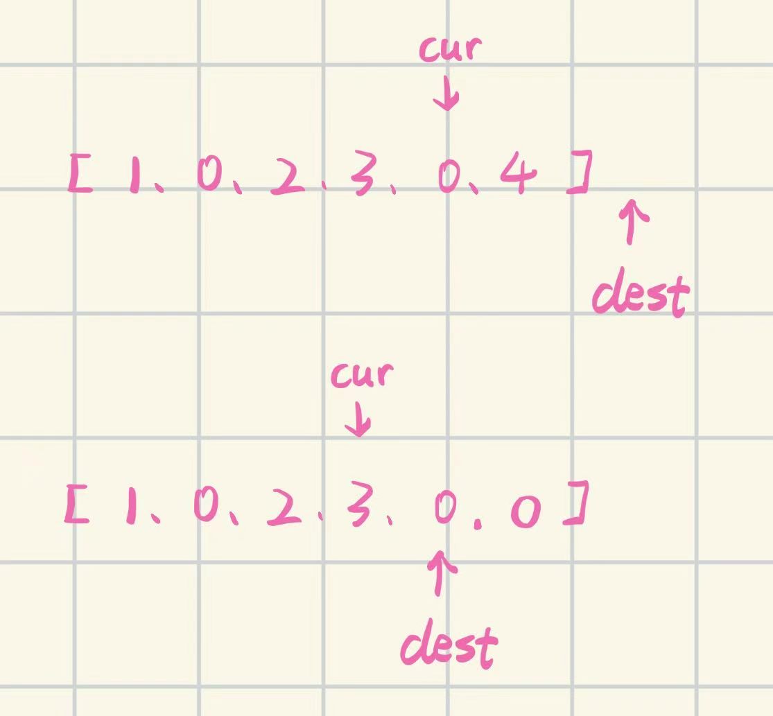 遇到非0元素:dest++,swap(dest,cur),cur++
