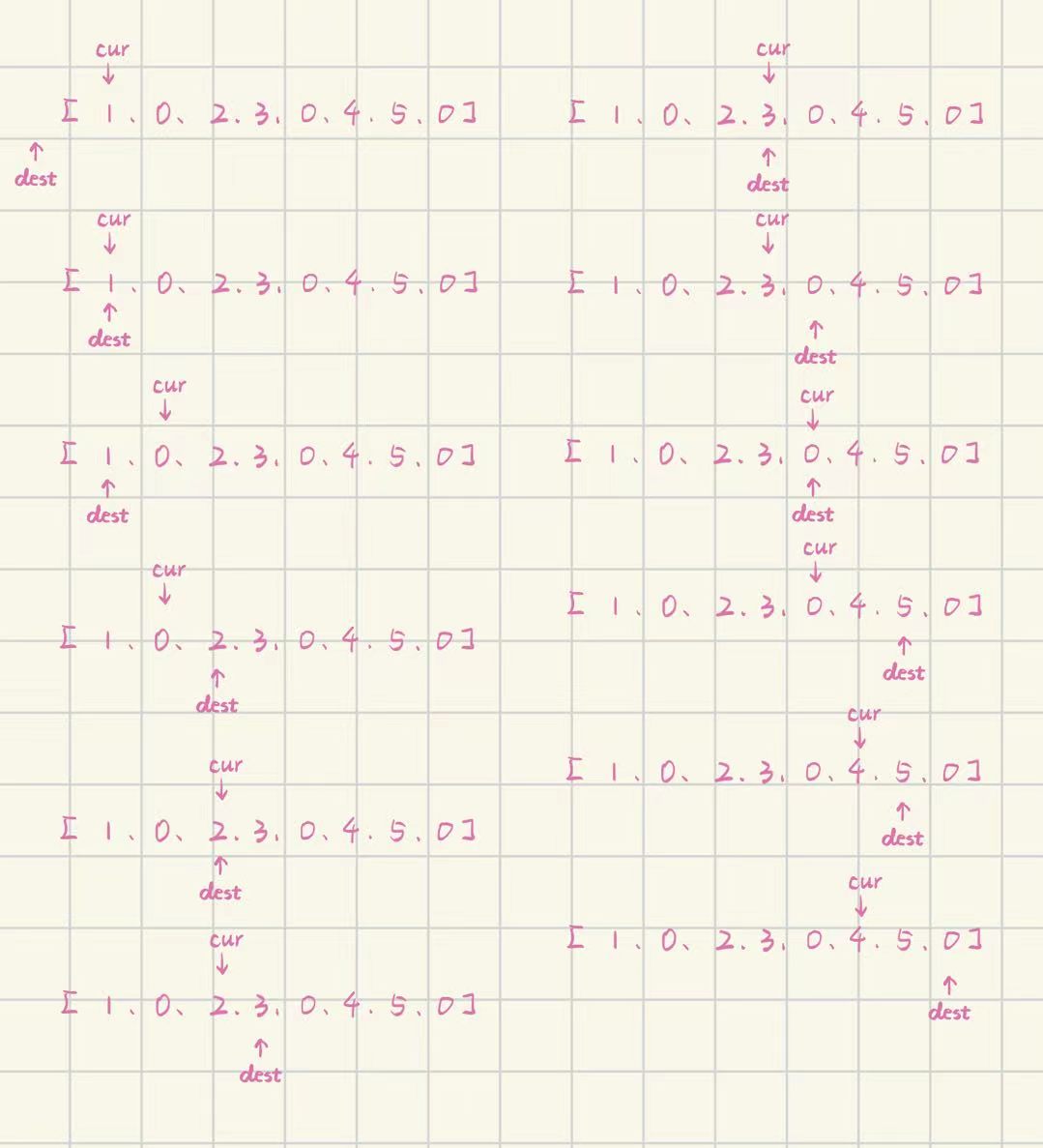 再判断dest是否已经走到结束为止,最后cur++,直到cur遍历整个数组