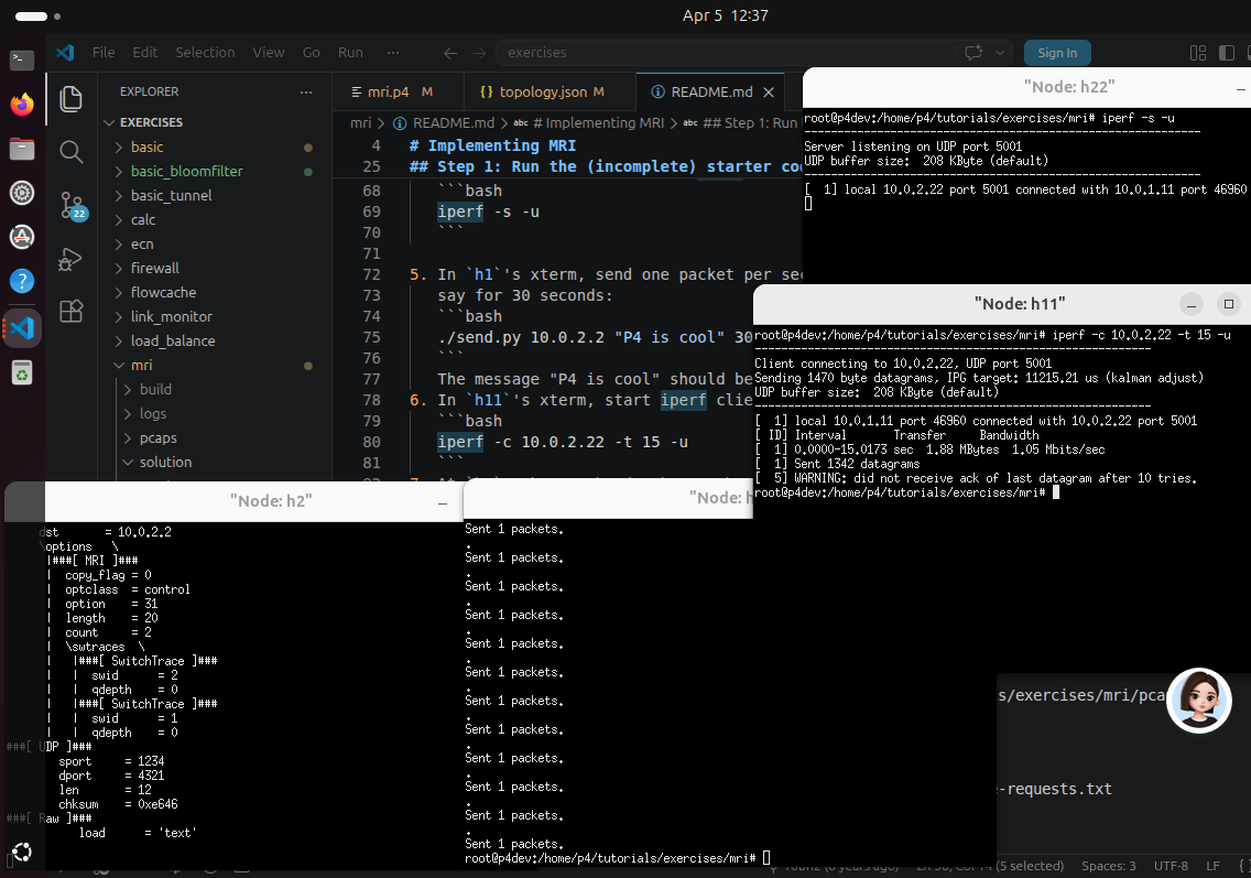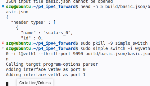 为啥会在我在h11中输入的之后原来的传输h1到h2的就卡壳了?而且就如图了 | | | 研究calc | |----------------|---------------------------------------------------------------------------------------------------------------------------------------------------------------------------------------------------------------------------------------------------------| | struct headers | 方便用hdr调用 以太网头(Ethernet Header)就是数据包的「最外层信封】。 | | parser | packet.extract(hdr.ethernet); 从数据包里,按顺序把第一个头(以太网头)拆出来,放到 hdr.ethernet 这个位置里 packet.lookahead<T>() 「偷看」数据包里接下来的内容,但不移动读取指针、不修改数据包状态,相当于「预读」。 预读接下来的p4calc_t结构体,取出p、four、ver三个字段,用来做合法性校验。 parser(解析器)= 拆快递,用 extract 把包裹拆开,把里面的东西拿出来,放在桌子上(hdr.p4calc) | | ingress | Send_back回包--把计算结果写进数据包 出端口->入端口 交换 MAC 地址是二层回显的强制要求,否则包发不回去 mark_to_drop(standard_metadata)--P4 内置函数,给这个包打上 "丢弃" 标记 | | |