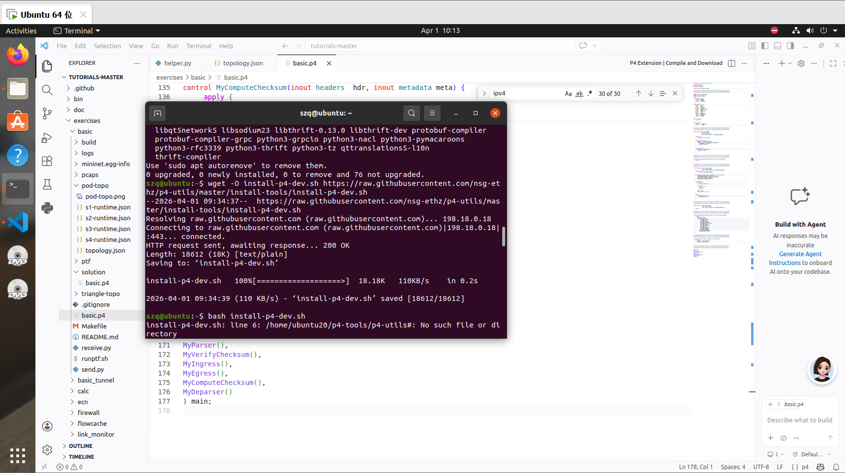 反复出现问题到凌晨,遂放弃,使用docker, 使用docker网络出问题,使用以下尝试补救 cd ~ sudo apt install git gcc cmake make wget -O install-p4-dev.sh https://raw.githubusercontent.com/nsg-ethz/p4-utils/master/install-tools/install-p4-dev.sh bash install-p4-dev.sh