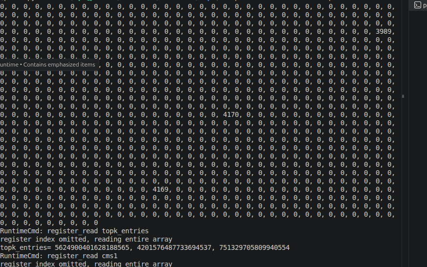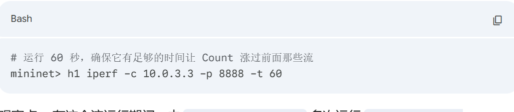 不能用++循环,要用transition 即使新流不足以替换 Top-K 里的最小值,也要给这个最小值的计数 + 1(避免低活跃流长期占据 Top-K 位置) cms_hash[0]--res_pos_one | | mininet> h1 iperf -c 10.0.3.3 -P 4 -t 10 register_read cms1 register_read cms2 register_read topk_entries 第 1 个包:SYN(触发一次 + 1) |