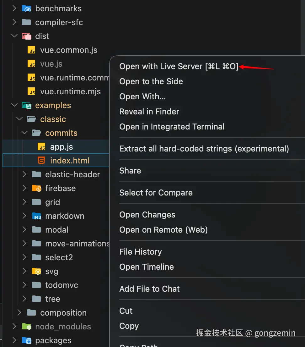 安装好插件后,打开文件的上下文菜单 可以看到Open with Live Server