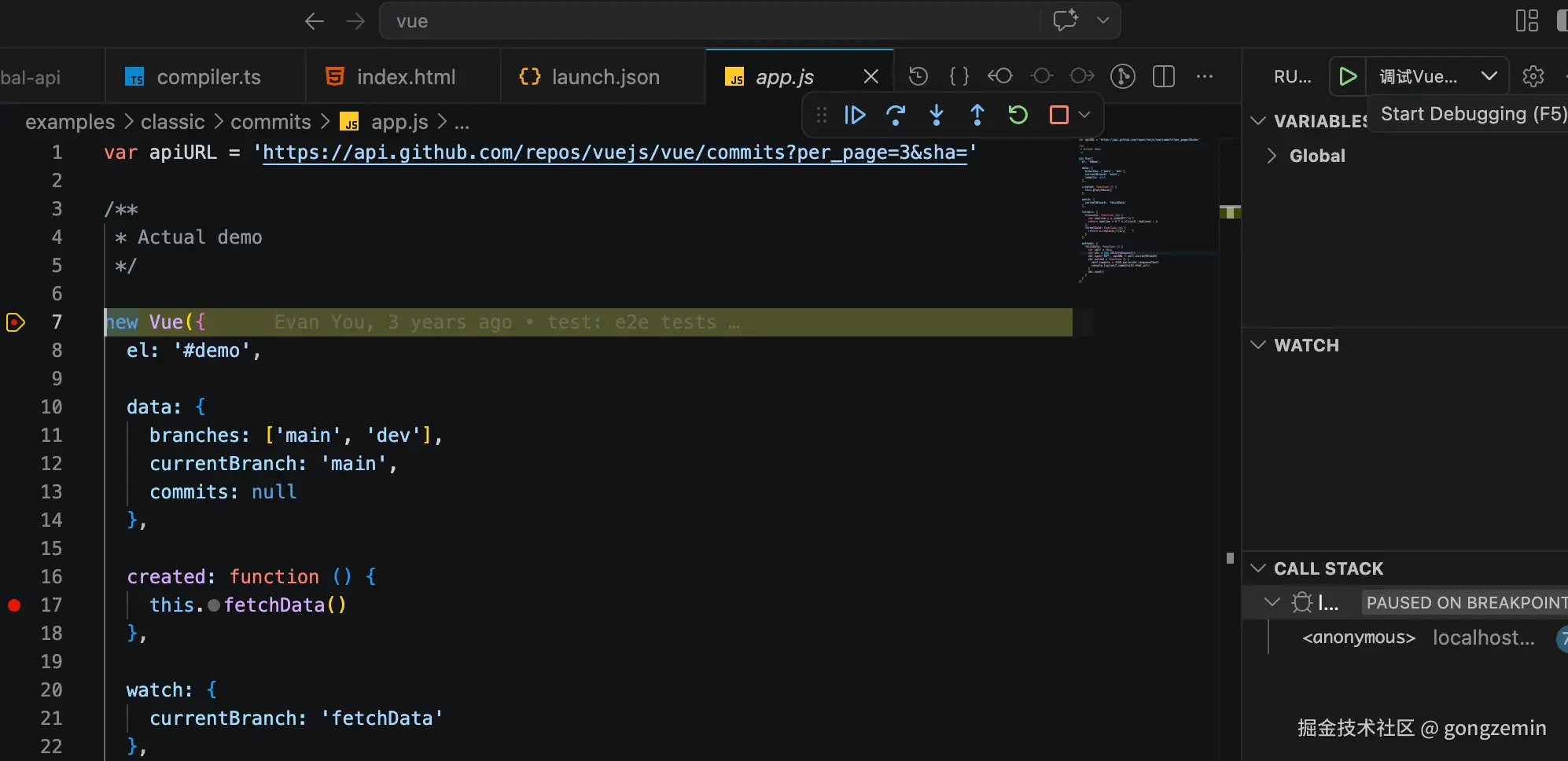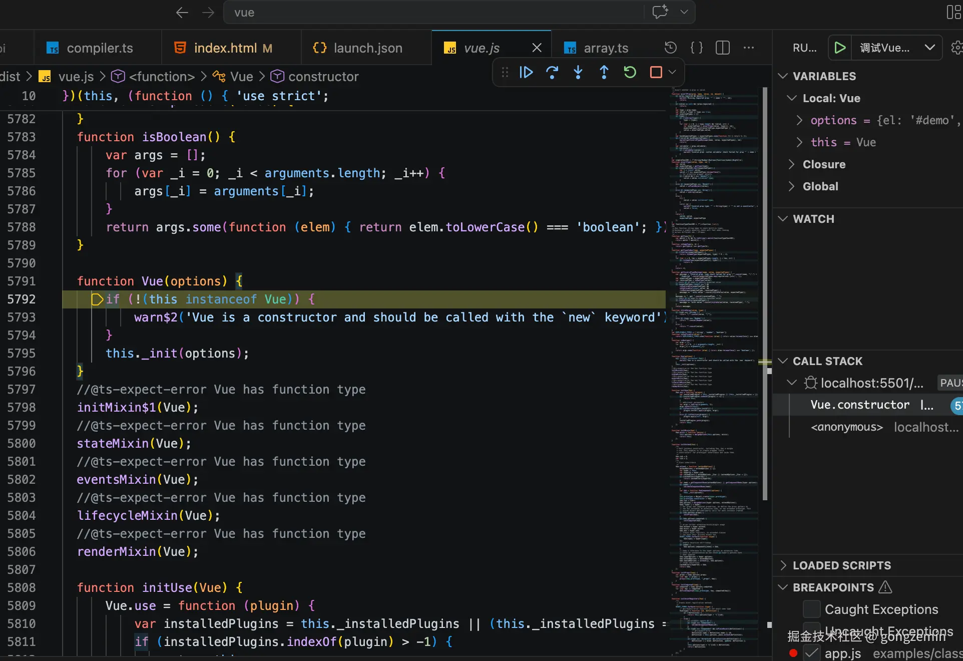 - 在/examples/ 下随便找个文件(引入的文件要是我们生成的vue.js) 打上断点