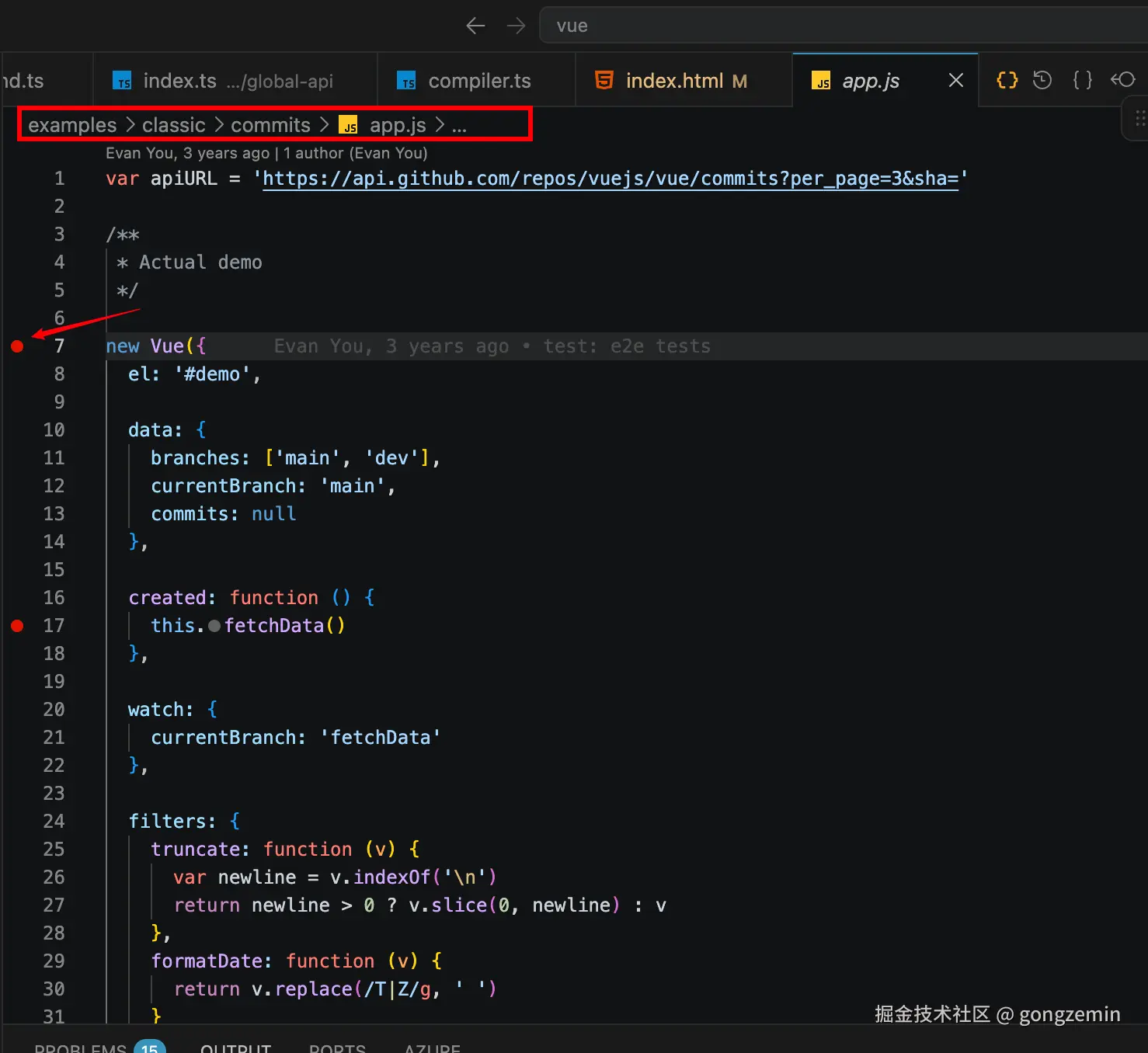 我们找examples/classic/commits/app.js 在如图位置打上断点
