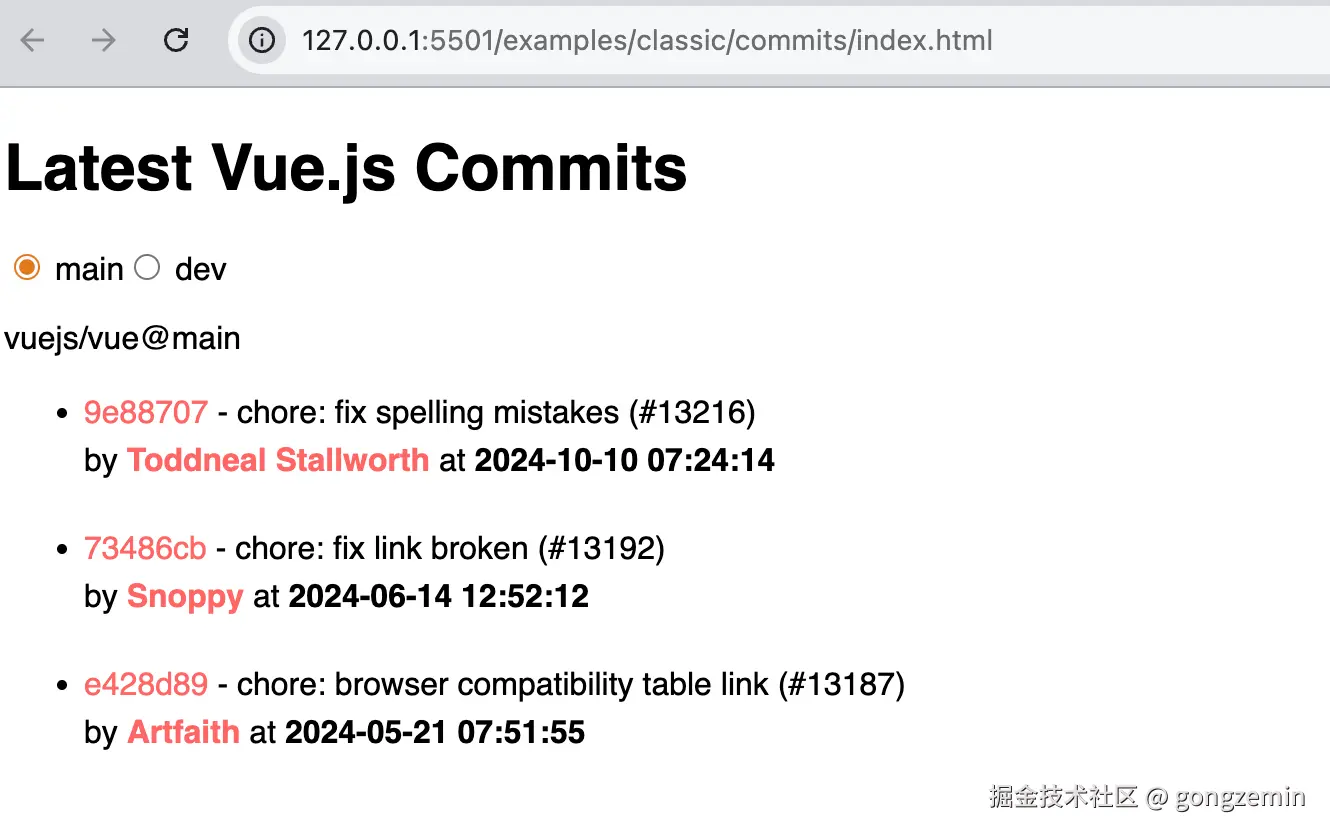 这样我们就可以打开我们的examples/classic/commits/index.html 文件了 是用服务器打开的